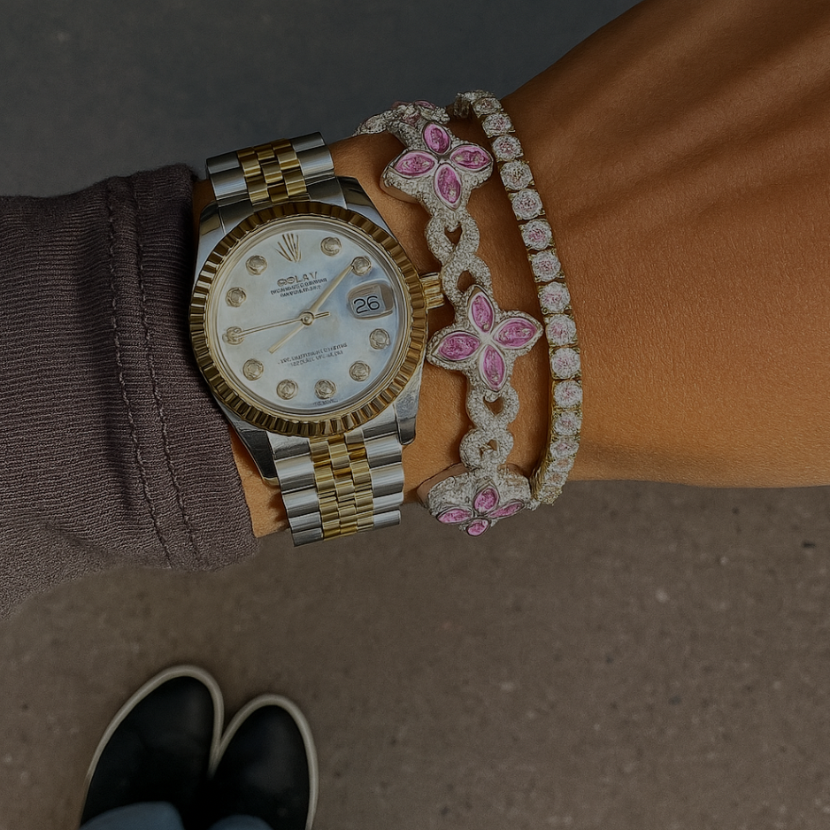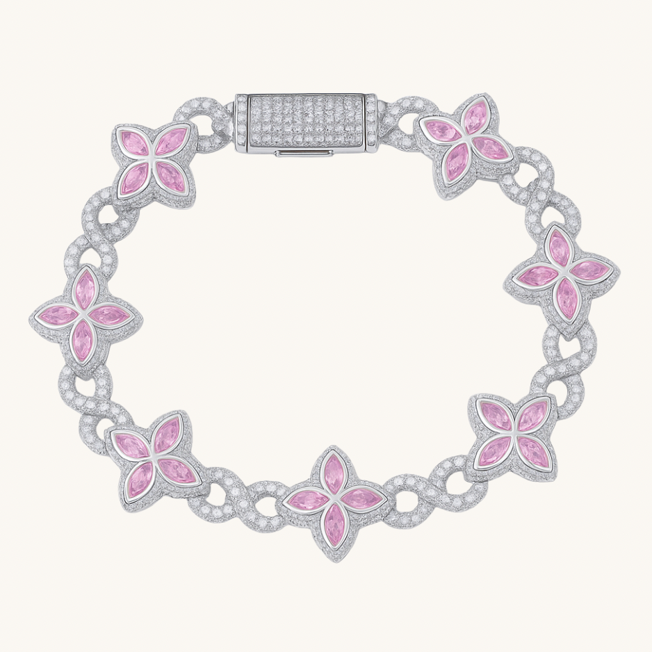 Adorned with pink clover accents and sparkling infinity links, this silver bracelet adds a delicate pop of color to any look. A sweet piece to wear solo or layer up.