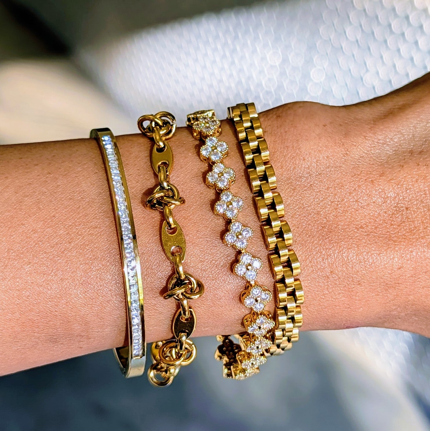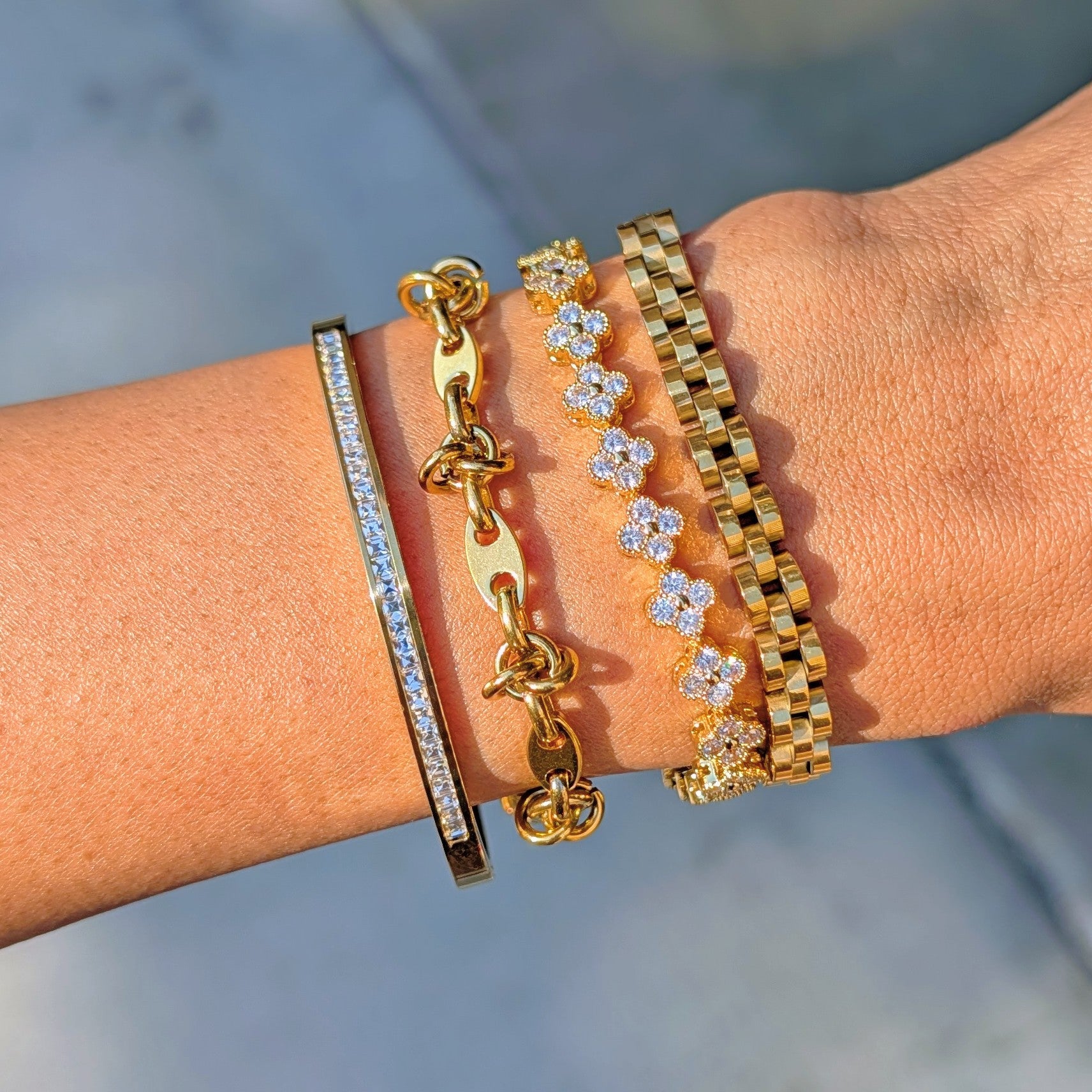 A versatile bracelet set featuring four distinct styles, from sleek bangles to clover-inspired links with subtle sparkle. Designed for easy stacking, this set adds texture, shine, and charm to any everyday or dressed-up look.