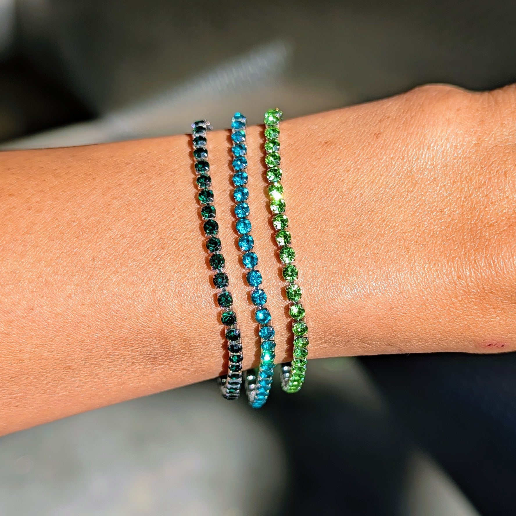 A refreshing bracelet set featuring vibrant aqua and green-toned stones that bring a bright, modern touch to your stack. Designed for effortless layering, these pieces add color, sparkle, and a polished finish to any look.