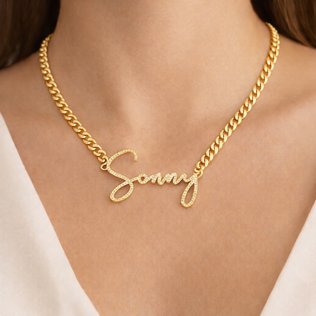 A personalized necklace featuring a graceful script design accented with sparkling diamond-style stones. Finished with a radiant gold chain, this piece delivers timeless elegance and a meaningful touch of luxury for everyday wear or gifting.