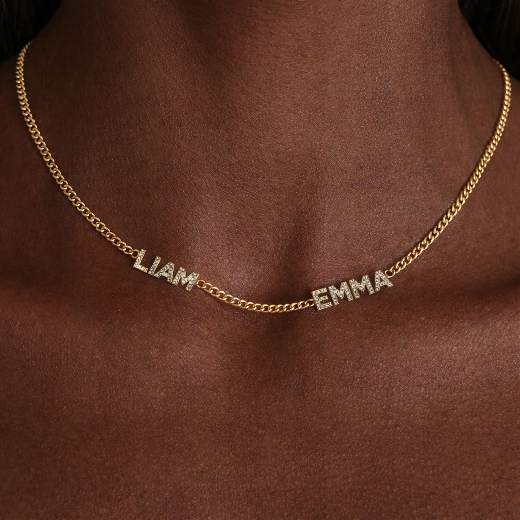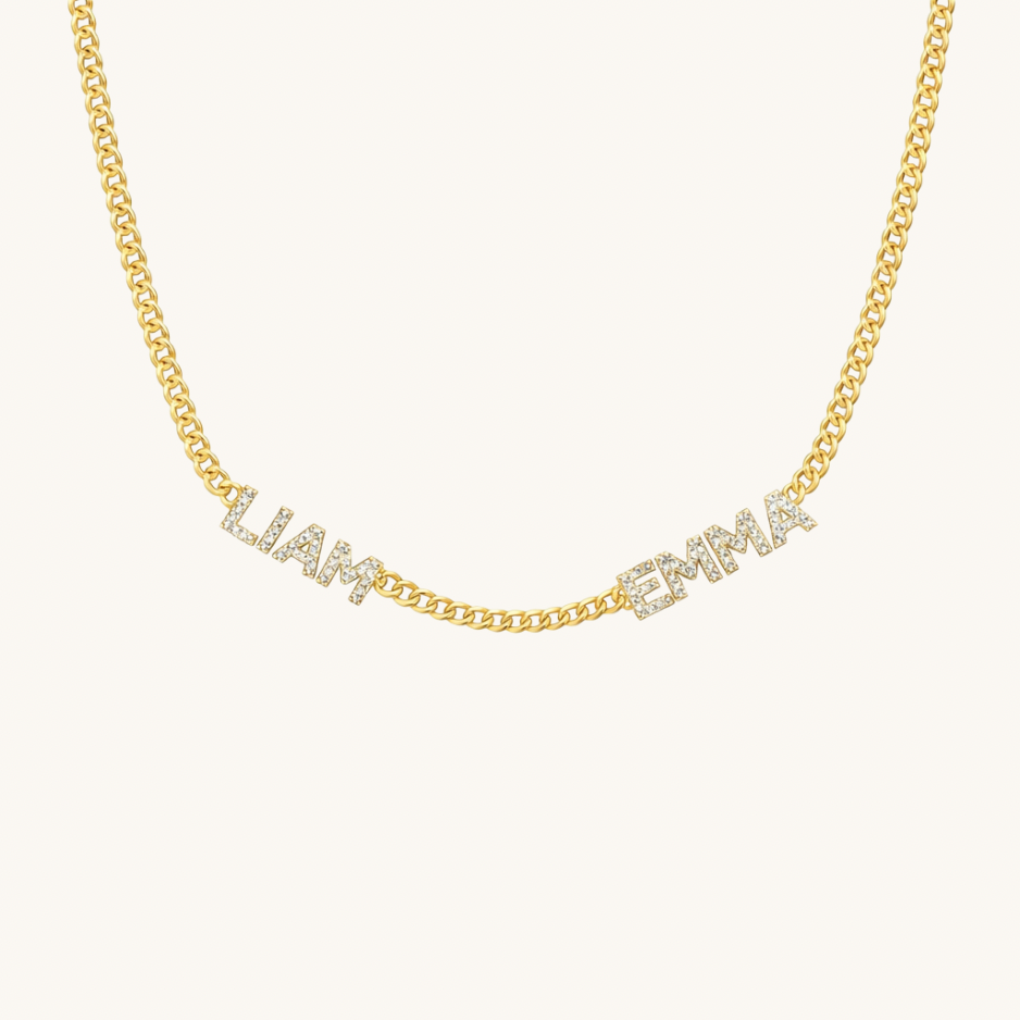 A personalized necklace designed with a radiant gold finish and shimmering diamond-style stones. Elegant and timeless, this piece adds a meaningful touch of sparkle that’s perfect for everyday wear or special gifting.