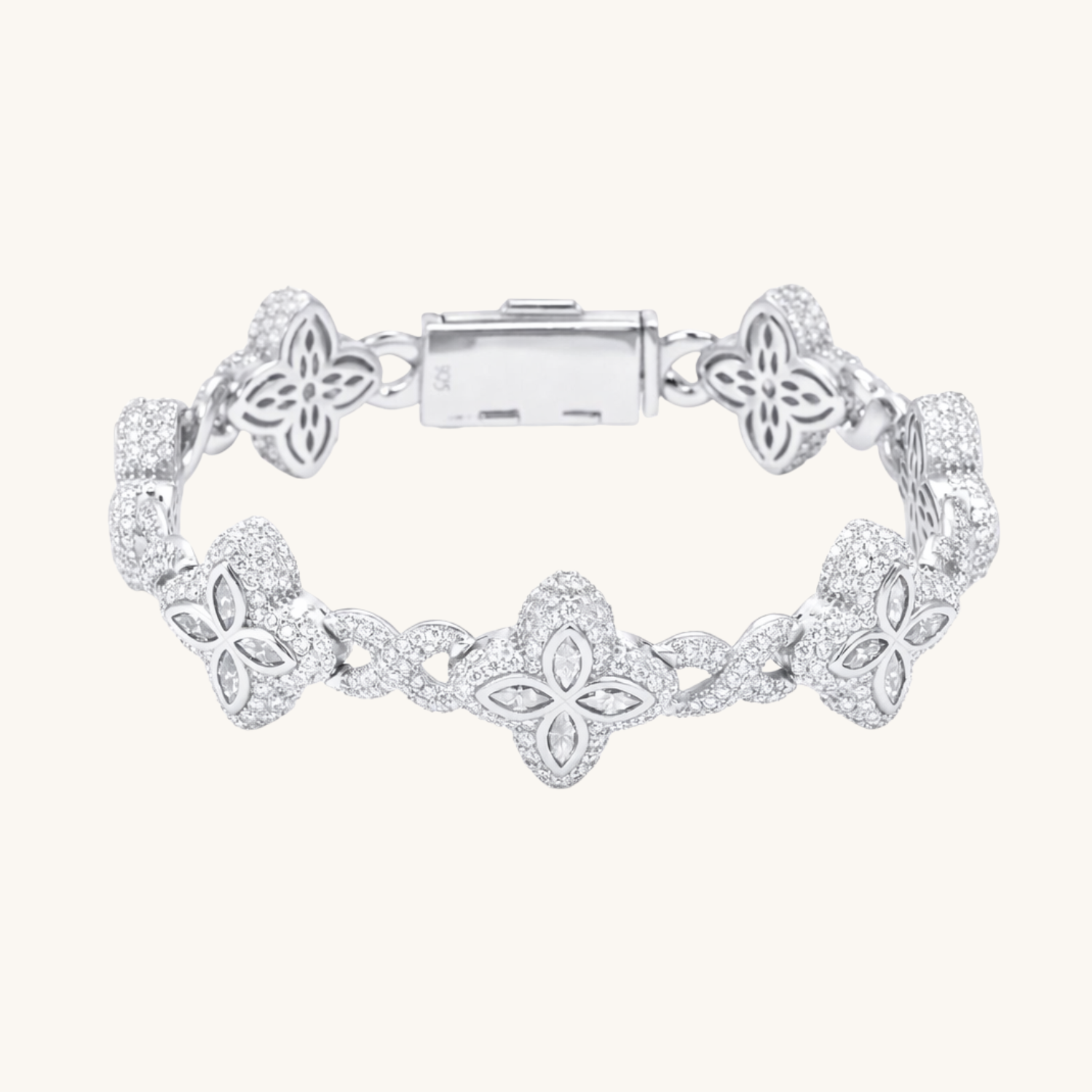 A sparkling blend of charm and meaning—this bracelet features icy clover motifs linked by shimmering infinity symbols. Perfect for stacking or making a solo statement.