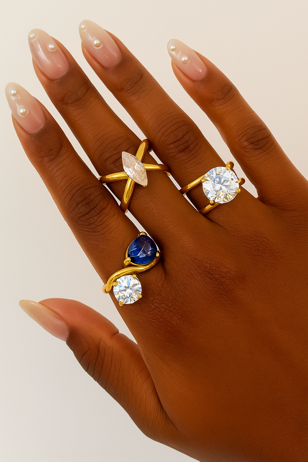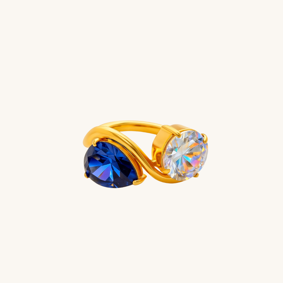 Featuring a striking contrast between deep sapphire and radiant diamond-like crystals, this gold-tone ring wraps elegantly around your finger with modern flair. Perfect for those who love a bit of drama, sparkle, and timeless color.