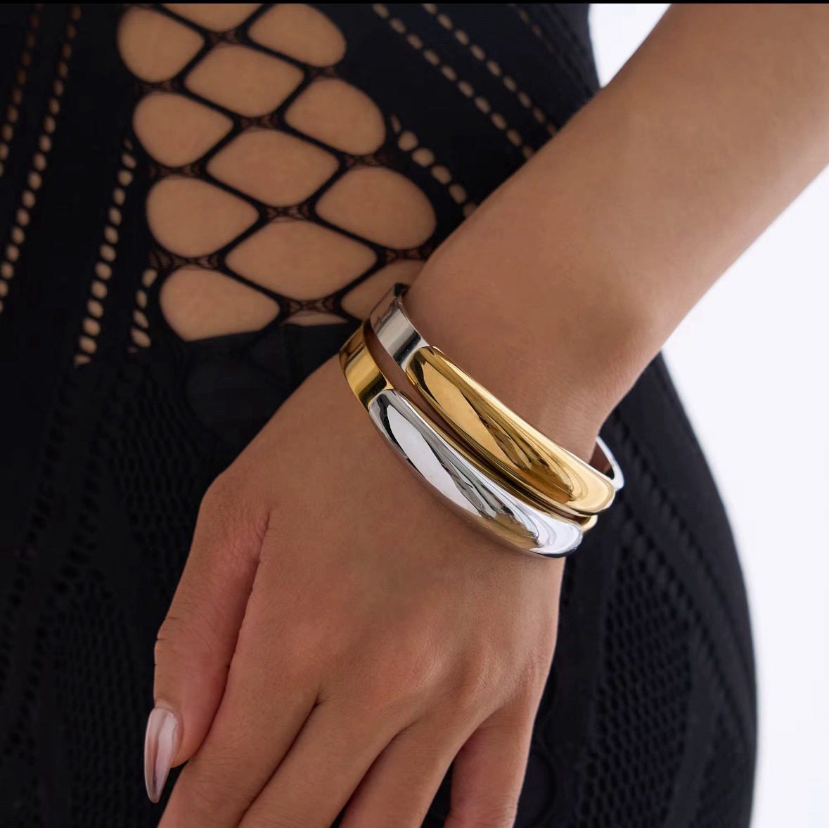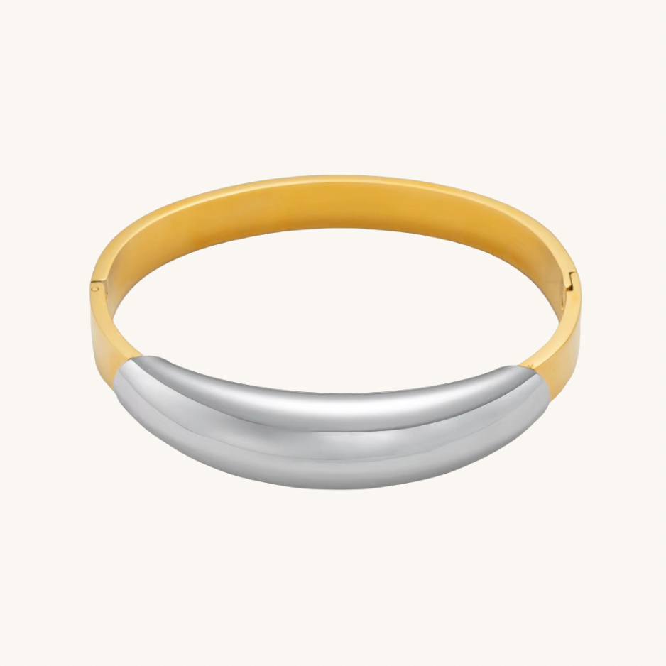 This two-tone dome bangle blends smooth silver and warm gold in a bold, minimal silhouette. Its modern curve makes it the perfect wear-anywhere piece—effortless on its own, yet stunning stacked.