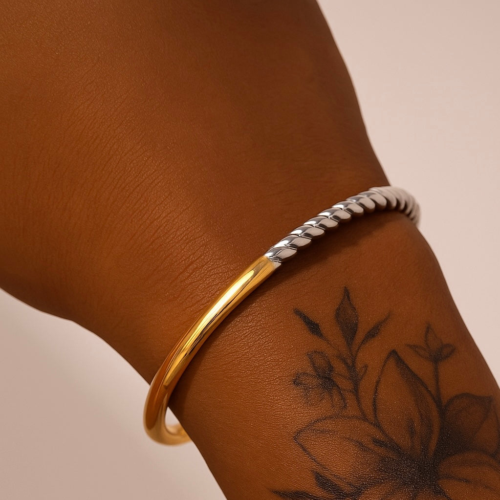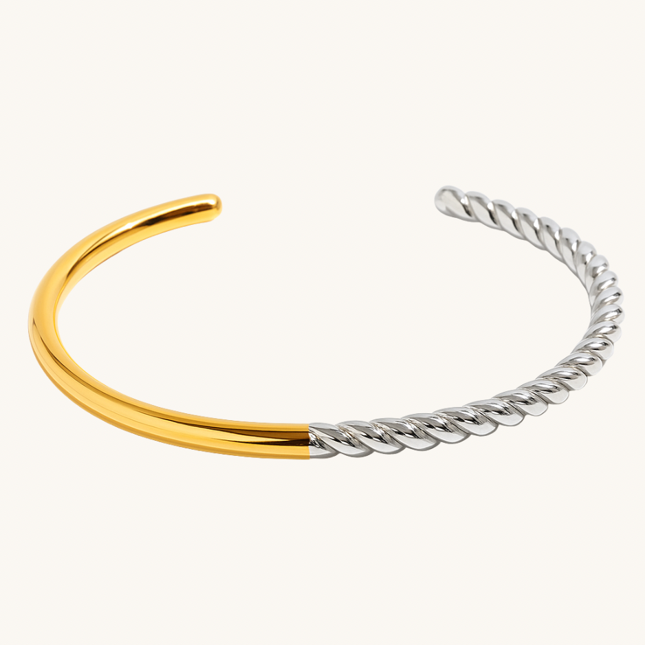 This open cuff plays with contrast—sleek gold on one side, twisted silver on the other. Minimal yet edgy, it’s designed to add texture and interest to your everyday stack or stand bold all on its own.